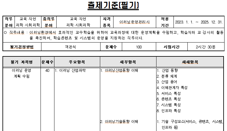 | 이러닝운영관리사 필기 출제기준 1과목 이러닝 운영계획수립 정리 (3) (0) | 2023.11.22 |