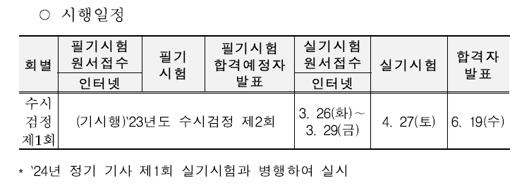 이번 1회에 시험보신 분들은 시험장에서도 공지를 했지만, 24년 4월 27에 정기 기사 1회 실기시험과 병행이 됩니다. 저는 1회에 다른 시험을 봐야할 것 같아서 아쉽긴 하네요. 국가기술자격시험 처음에 보시는 분들은 접수를 빨리 하셔서 집과 가까운 곳에서 시험보시기 바랍니다.